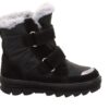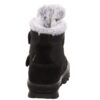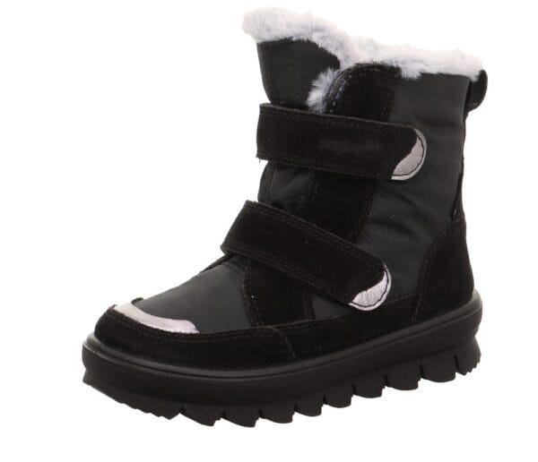 Dívčí zimní boty FLAVIA black s membránou Gore-Tex, superfit , 1-000216-0000 v černé barvě. Zimní boty FLAVIA kombinují pohodlí a styl se sportovním nádechem. Módní kombinace semiše, efektní kůže a textilu spolu s kovovými akcenty na suchých zipech a špičkách vytváří působivý vzhled. elegantní límec z umělé kožešiny na svršku dodává botám šmrnc, zatímco funkční prvky zajišťují maximální komfort i v chladném počasí.
