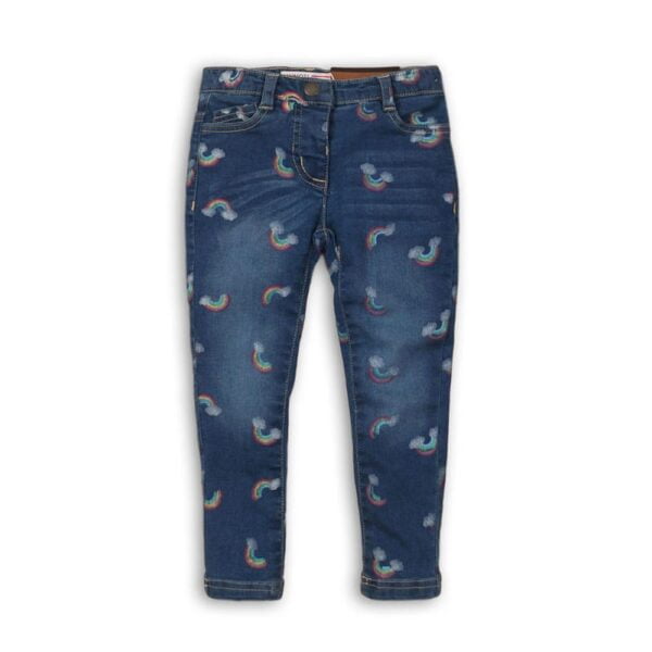 kalhoty dívčí džínové s elastanem Minoti Unicorn 10  Dívčí džínové kalhoty s elastanem, zapínání na knoflík, dvě přední kapsy, s celoplošnými obrázky duhy