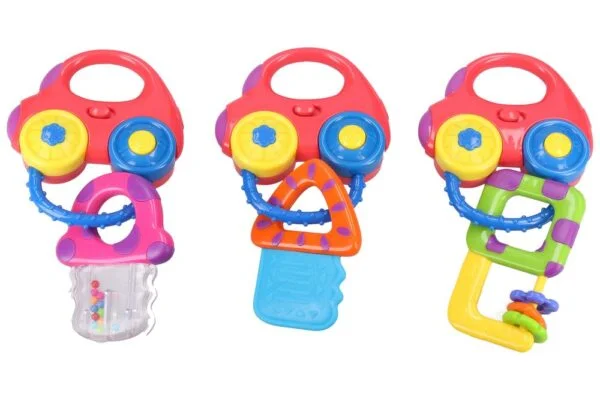 3 varianty – růžový, oranžový, zelený. Klíče k autu – interaktivní hračka vhodná pro miminka již od narození. Zaujme především zvukovými efekty. Hraje veselé melodie a vydává zvuky auta. Baterie součástí balení, nelze měnit.