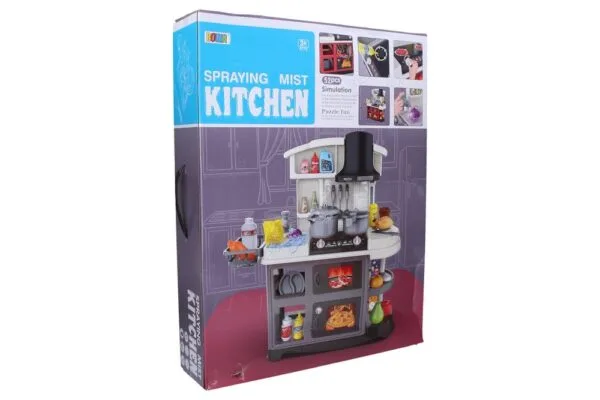 Kuchyňka. Rozměry 56 x 25,5 x 58,5 cm. Funkce – otočením knoflíku na sporáku světelné a zvukové efekty plotýnky, tekoucí voda. 3xAA baterie nejsou součástí. Kuchyňka.
