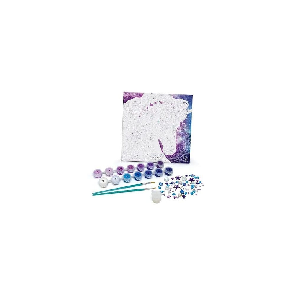 Nebulous Stars Kreativní tvoření Nebulia a kůň, Nebulous Stars, W031458 klasická aktivita založená na malování podle čísel na tištěném plátně s dřevěným rámem. Dodej obrázkům špetku zářivosti pomocí drahokamů a třpytivého laku.