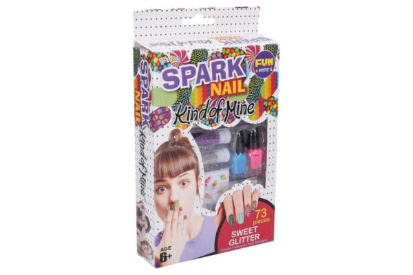 Nehtový set – třpytky se sladkostmi. Součástí 2 barevné laky, 12 nehtů, štěteček, pilník, nehtové nálepky, 2 druhy třpytek, 42 nálepek sladkostí, návod. Staň se manikérkou a dopřej svým nehtům krásný a stylový vzhled! Díky setu si můžeš vytvořit originální třpytivé nehty s motivem sladkostí!