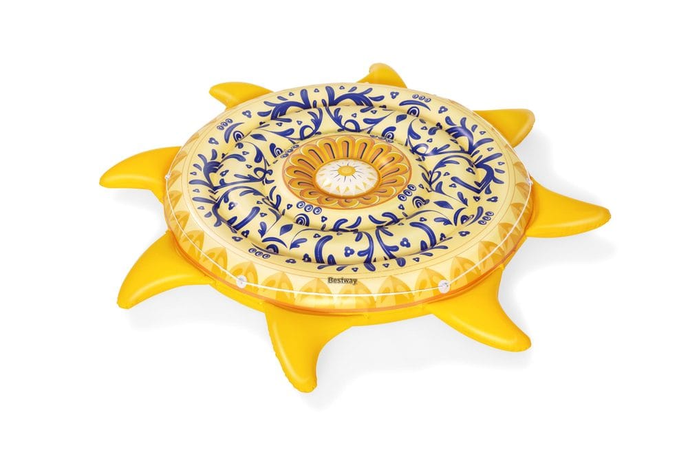 Užijte si léto ve velkém stylu s nafukovacím lehátkem ve tvaru Slunce. barevné vzory na lehátku jsou inspirovány tradičním středomořským a sicilským uměním. Snadné nafouknutí, vyfouknutí a složení.Provaz pro uchopení s průchodkami po celém obvodu.Sada obsahuje: 1 nafukovací lehátko, 1 opravnou záplatu.