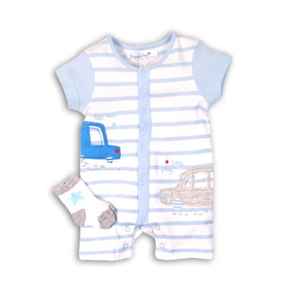 overal letní, ponožky Minoti CITY 8 Kojenecký letní overal, propínání na cvočky v předu a mezi nohama, v předu vyšívání, v setu s ponožkami. Barva světle modráSložení: 100% bavlna