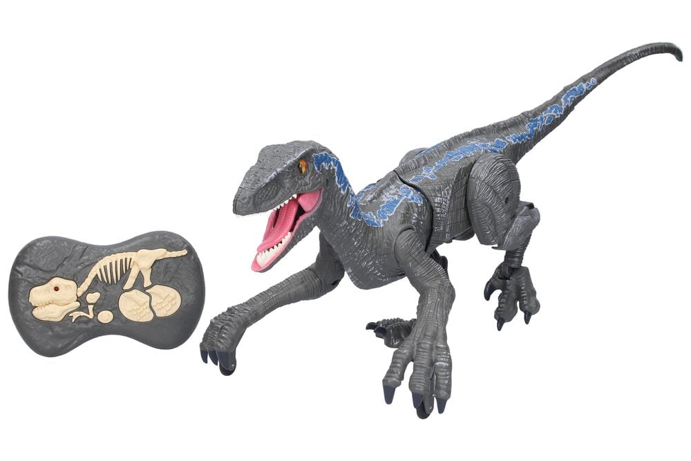 Dinosaurus RC. Šedá barva. Velikost 45 cm. Frekvence 2.4 GHz. Světelné a zvukové efekty. Reálná chůze, chodí všemi směry. Bateriový pack pro dinosaura součástí, 2xAA pro ovladač není součástí. USB nabíjení. Nabíjení 2h, provoz 45 min, dosah 40 m.