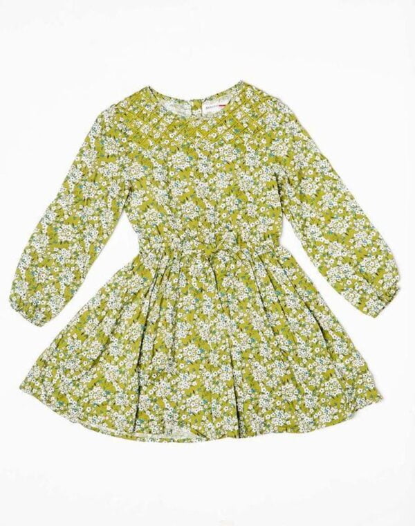 Šaty dívčí Minoti FOREST 4 Dívčí šaty v pase a na konci rukávu s gumou. Šaty jsou v zelené barvě s kytičkami.