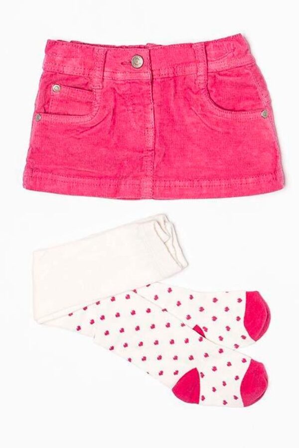 Holčičí sukně je vyrobena z kordu, punčochy jsou světlé se srdíčky v barvě sukně.