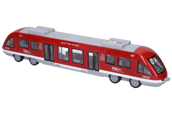 vlak s efekty. Velikost 44,5 x 5,8 x 9 cm. Světelné a zvukové efekty, aktivace tlačítky na střeše. Na setrvačník. Vlak s efekty.