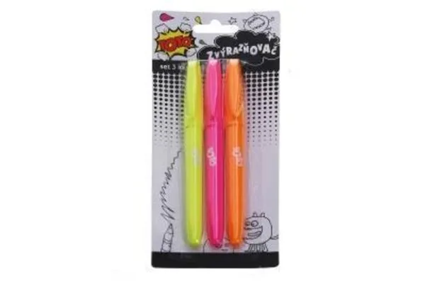 Sada tří zvýrazňovačů s netradičním obalem a zavíracím vrškem. Zvýrazňovače jsou určené pro zvýrazňování textů na všech druzích papíru. Klínový hrot, šíře stopy 3 mm.